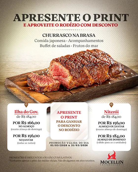 A Mocellin Churrascaria está presente na Ilha do Governador e em Niterói, em ambas com estacionamento com manobristas. As duas unidades contam com consultoria de chefs renomados e talentosos que criam pratos novos para o buffet.