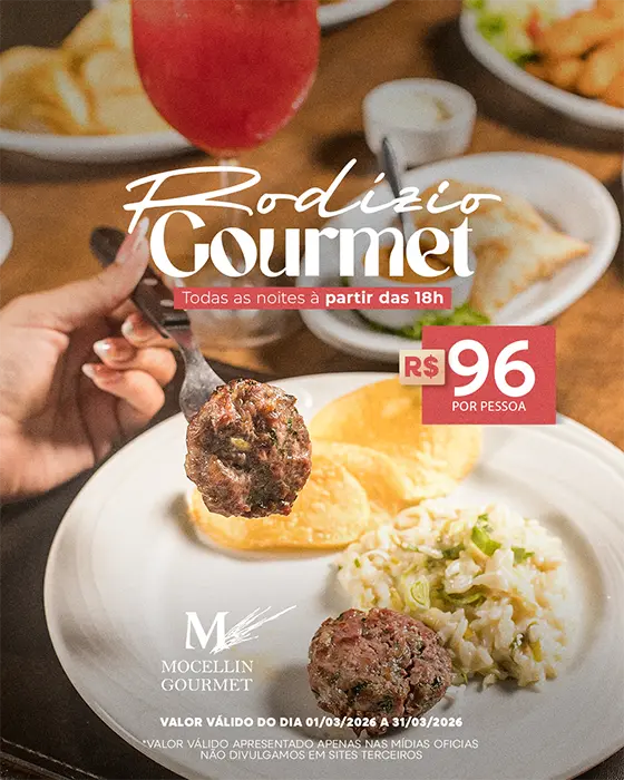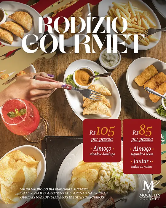 O destaque das noites é o rodízio de petiscos do Mocellin Gourmet que inclui diversas opções liberadas para você aproveitar em boas companhias. São petiscos, massas, carnes, pizzas… Tudo o que você mais ama com a qualidade que você merece está reunido em um rodízio inesquecível!