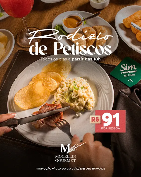 O destaque das noites é o rodízio de petiscos do Mocellin Gourmet que inclui diversas opções liberadas para você aproveitar em boas companhias. São petiscos, massas, carnes, pizzas… Tudo o que você mais ama com a qualidade que você merece está reunido em um rodízio inesquecível!